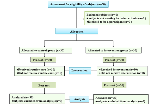 The study was conducted from January 2023 to July 2024 at Imam Reza referral teaching hospital in Amol, northern Iran. This hospital is one of the leading centers in Mazandaran province for the surgical treatment of diabetic foot ulcers. The study sample was elderly patients awaiting diabetic foot ulcer surgery, referred to this hospital. Inclusion criteria included age ≥60 years, awareness of time and place, having grade 3 or higher diabetic foot ulcers according to the Wagner Classification System use of a tablet or smartphone in the past, absence of visual impairment leading to color impairment, absence of impairment of the dominant hand to hold a digital pen, and no previous experience with diabetic foot surgery, no consumption of sedative or anti-anxiety medications and no medical history of psychiatric or stress-related disorders. Individuals were excluded if they did not wish to participate and continue in the study. In the current study, no participant expressed unwillingness to continue in the study and was not excluded from the study samples (Figure 1). The participants were non-randomly allocated via purposive sampling into two 30-person groups: intervention and control. To avoid information bias and direct contact between the samples in two groups, subjects with odd admission day numbers were first assigned to the control group and subjects with even admission day numbers to the intervention group. Subsequently, the subjects were selected by purposive sampling. The sample size was calculated based on pilot data from 20 patients awaiting diabetic foot ulcer surgery (10 per group), which showed a mean reduction of seven points in anxiety scores (SD=5.5) in the intervention group compared to 1 point (SD=6) in the control group. Using an effect size of d=0.8 (to ensure conservatism), a power of 90%, and α=0.05, G*Power software indicated a requirement of 26 participants per group. Accounting for a 10% attrition rate, the final sample size was set to 30 participants per group (Total N=60).