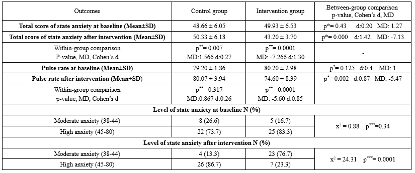 For state anxiety outcome, while no baseline difference existed between groups (control: 48.66±6.05 vs intervention: 49.93±6.53; p=0.43, d=0.20), post-intervention results revealed a clinically meaningful reduction in the intervention group (43.20±3.70) versus controls (50.33±6.18), with a significant between-group difference of -7.13 points (p <0.001, d=1.42, large effect). The proportion of high anxiety cases decreased from 83.3% to 23.3% in the intervention group (p <0.001), compared to 86.7% remaining high anxiety in controls. within-group analyses revealed a significant 6.73-point reduction in the intervention group (49.93 to 43.20; p<0.001, d=1.30) and 1.67-point increase in controls (48.66 to 50.33; p=0.007, d=0.27) (Table 2).